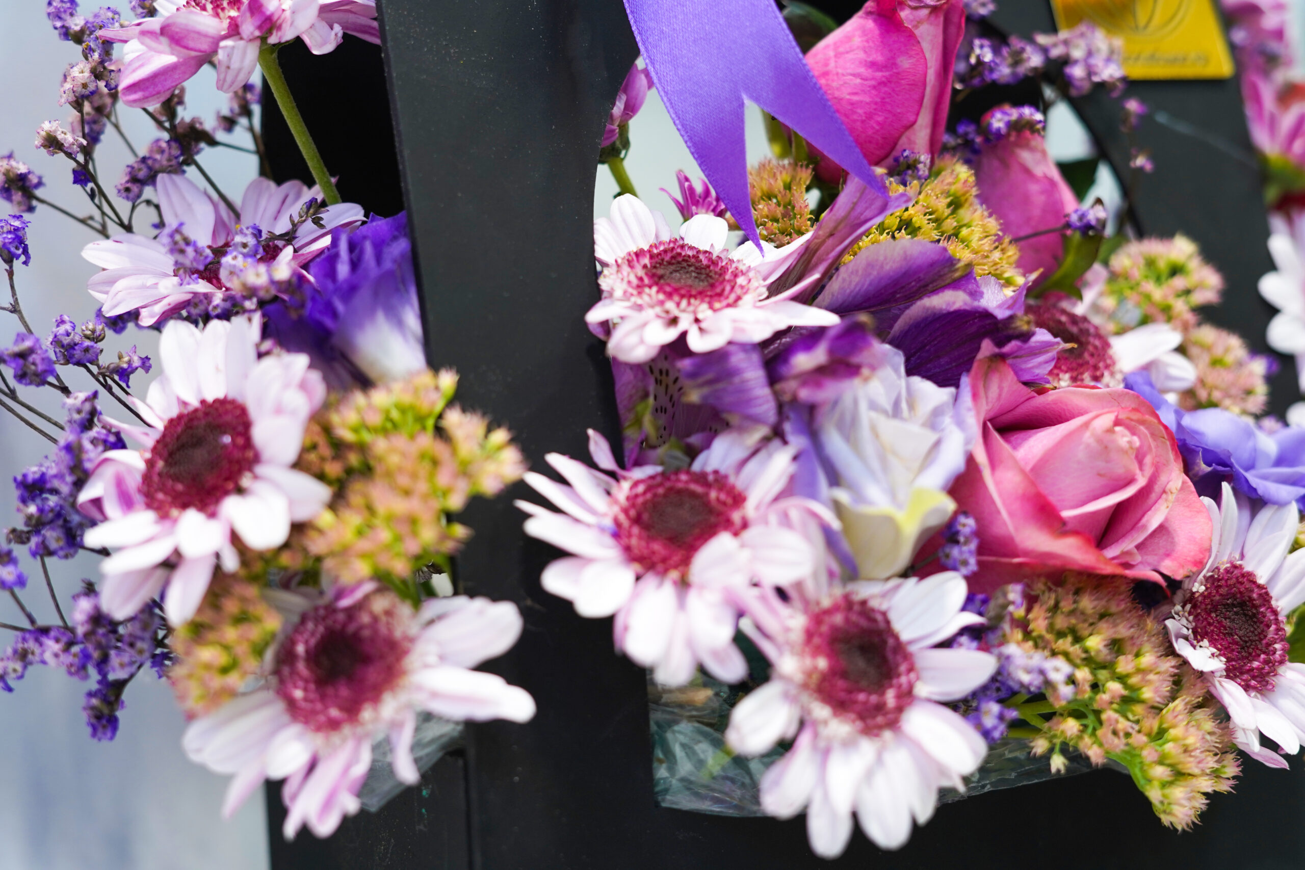 A matte black handle box finished with a satin violet bow, designed with playful side wings. Pink roses, white mini gerberas (burgundy centers), purple/white lisianthus, purple statice, and sedum clusters create a modern, eye catching look.